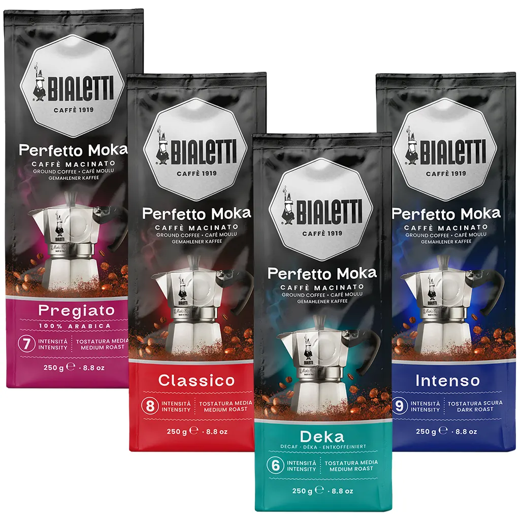 Bialetti Perfetto Moka Proefpakket | 4 x 250 gram | Classico, Intenso, Pregiato & Deka